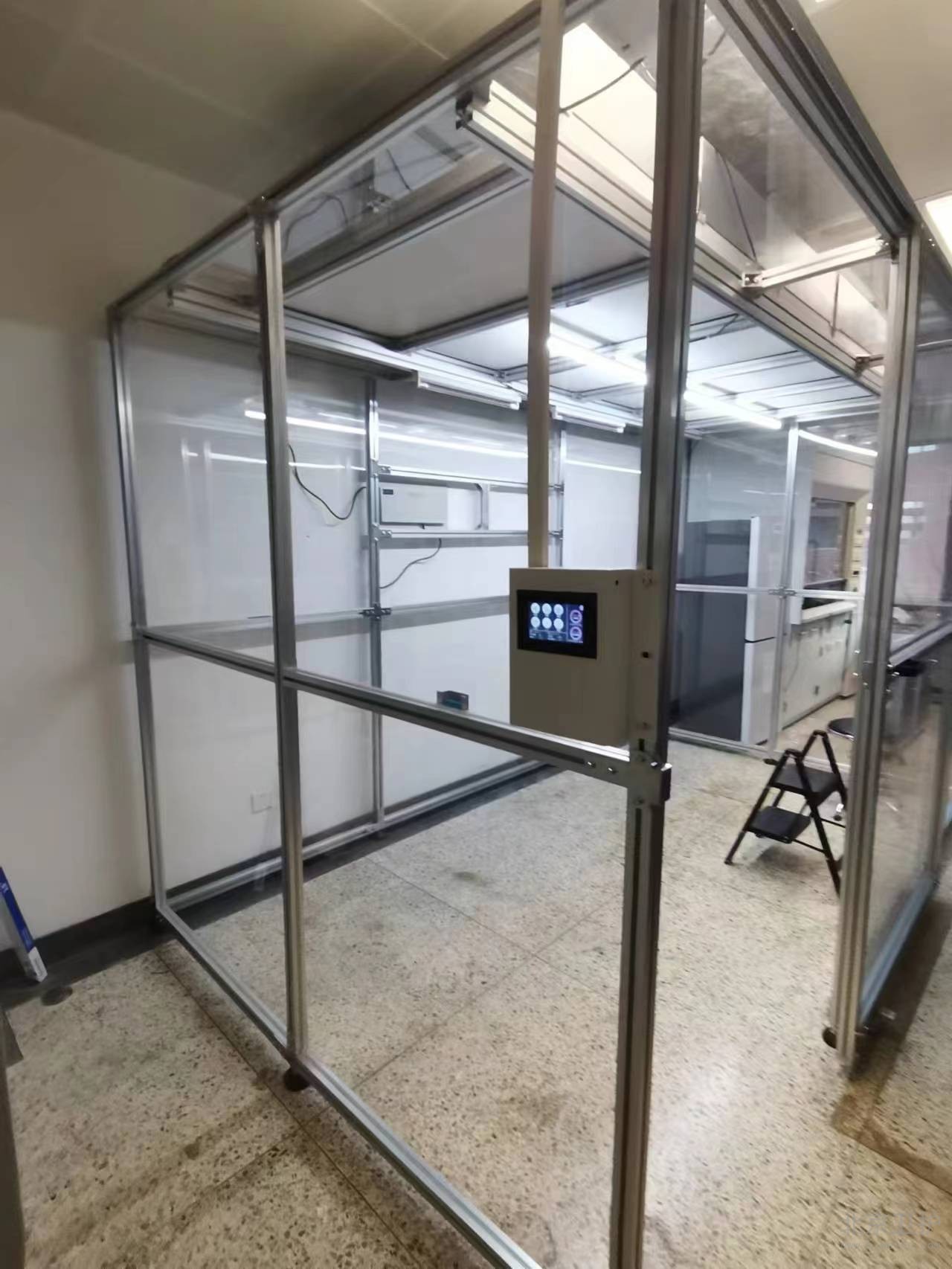 9月份我公司接到此項目后便抓緊時間出具相關(guān)方案、設計圖紙,經(jīng)過不斷的溝通和改動,最終確定施工方案。此單位潔凈棚設計面積20平米,主體材質(zhì)為鋁型材,隔離板使用亞格力板,頂部配有紫外線燈輔助殺菌,過濾系統(tǒng)為百級凈化模塊,并配有我公司研發(fā)的控制系統(tǒng)。從最初的方案設計、安裝施工,到最后的驗收,總工期為10個工作日。